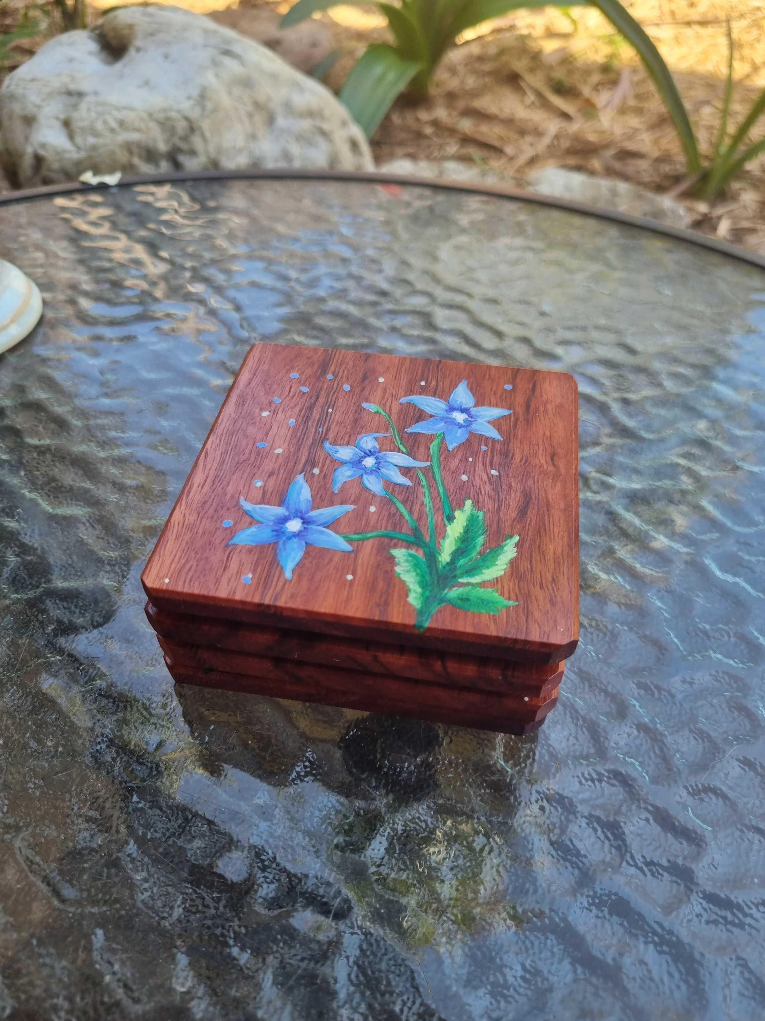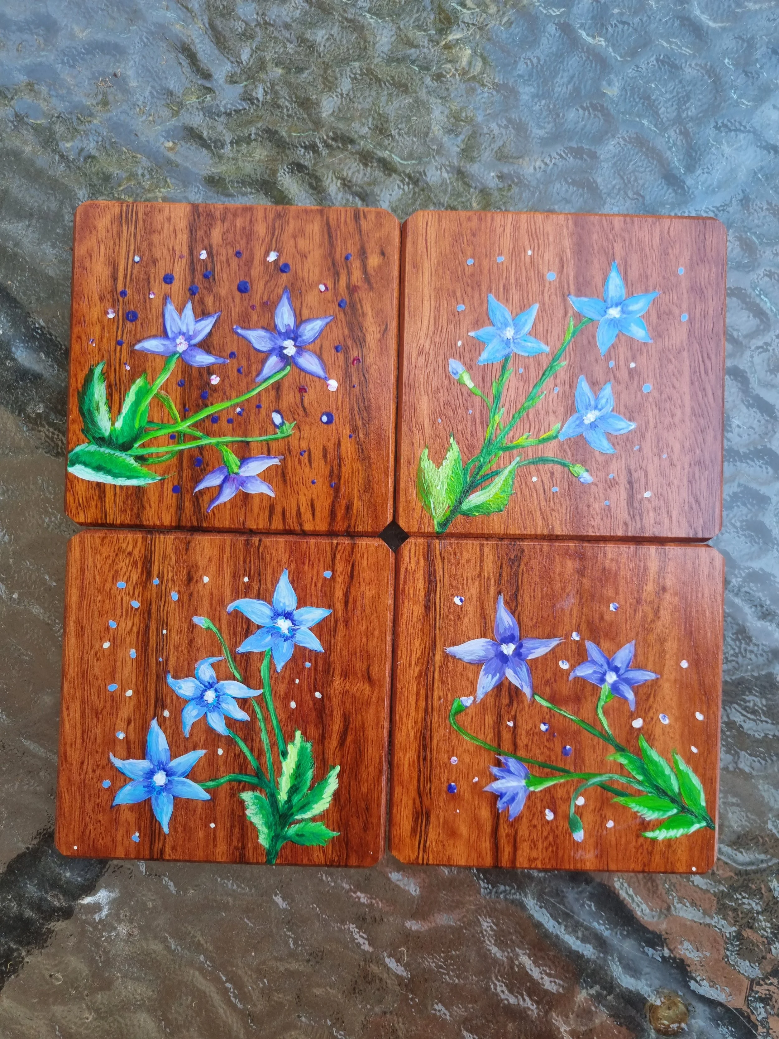 Australian native bluebells were hand painted on each coaster.