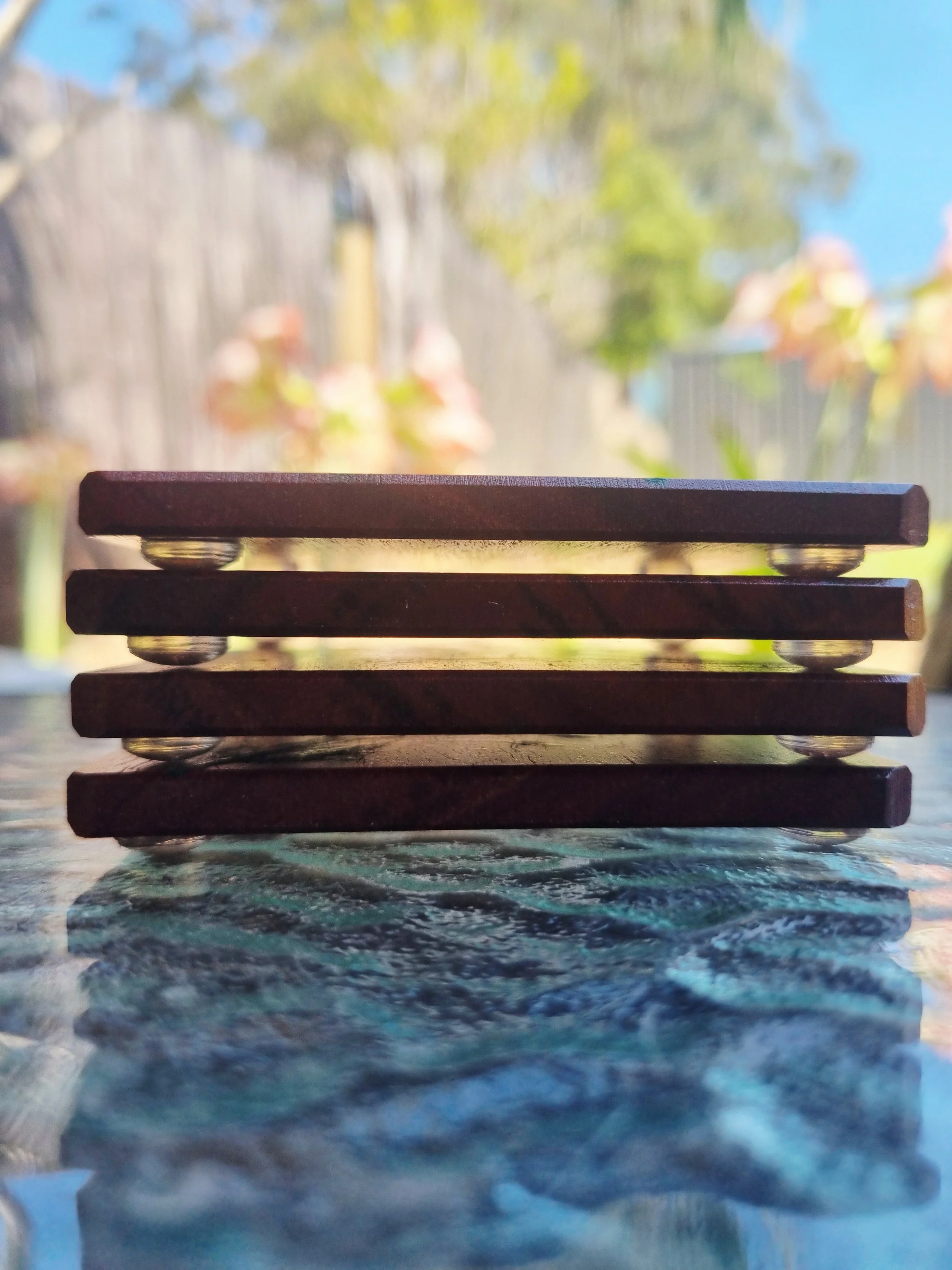 A set of 4 wooden coasters handmade on Jarrah Australian wood sourced sustainably.